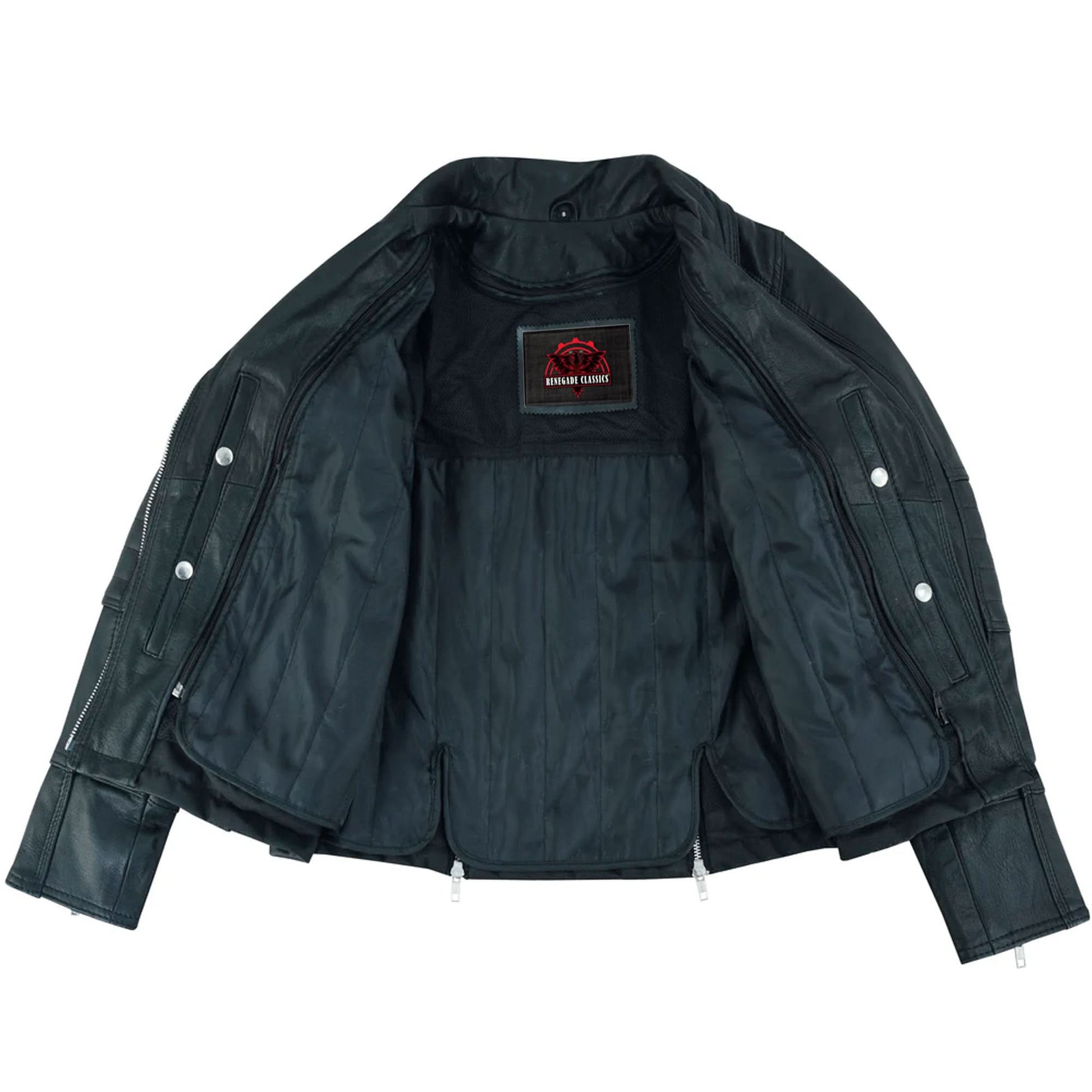 2 inside concealed gun pockets made of special heavy-duty textile with built-in holsters and snap closure.