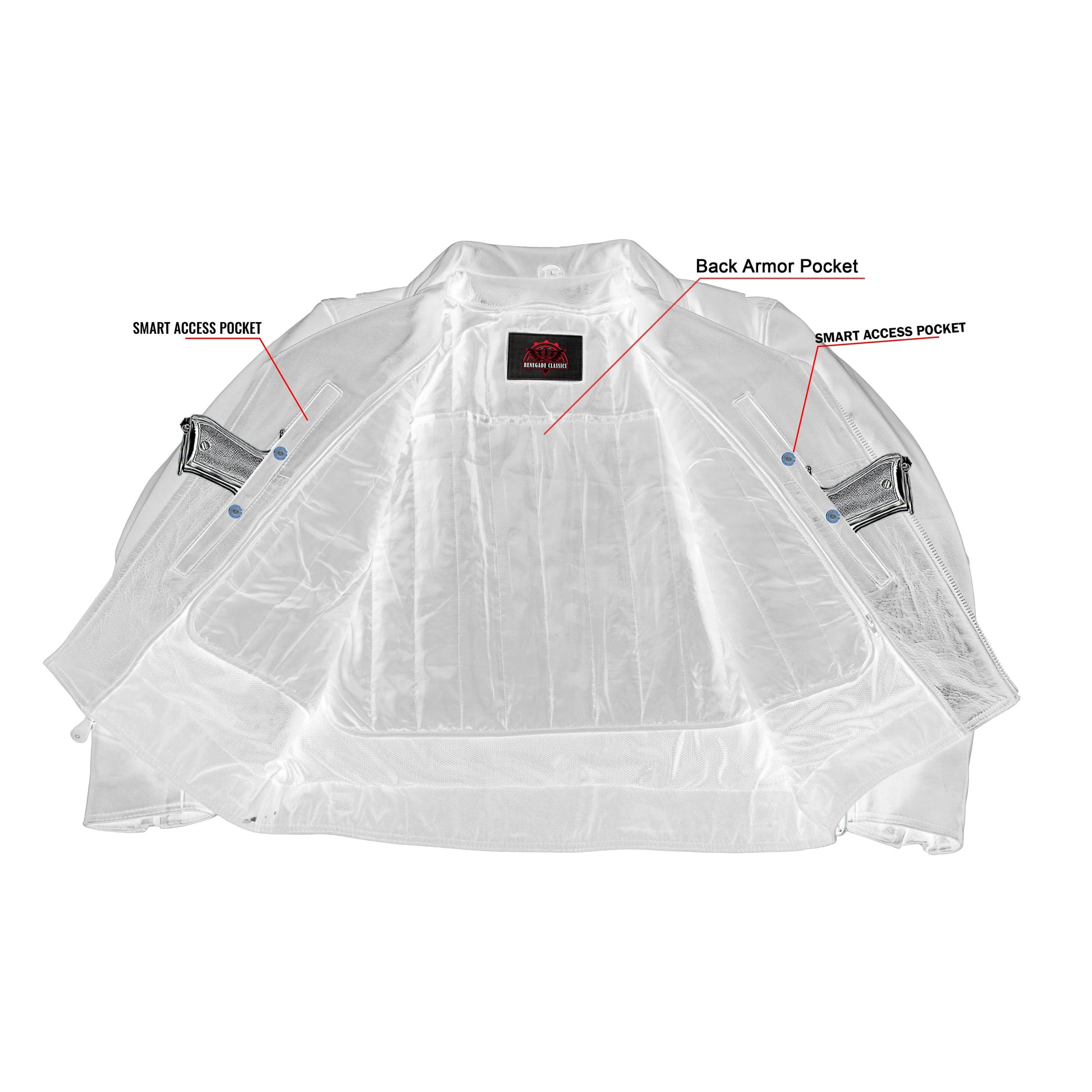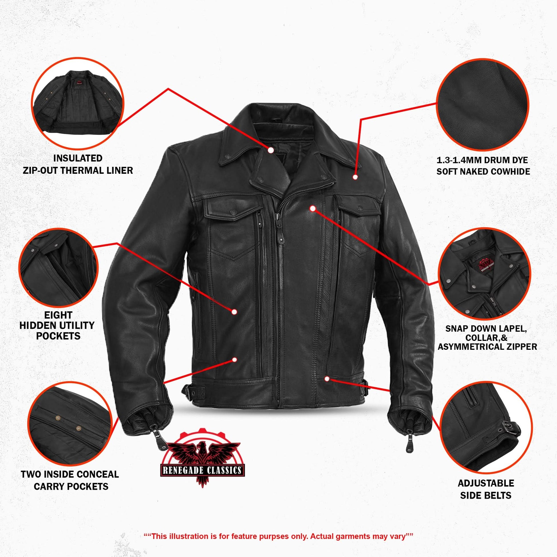 The ShadowRider Men’s Motorcycle Leather Jacket combines premium style, protection, and functionality. Crafted from soft drum-dyed naked cowhide leather (1.3–1.4 mm), it features a snap-down lapel with asymmetrical front zipper, zippered sleeves with gussets, and adjustable side belts for a perfect fit. Storage is plentiful with flap chest pockets, zippered slash pockets, eight hidden utility pockets, and two concealed-carry pockets with elastic holsters. Designed for all-season comfort, it includes a zip-out insulated thermal liner, underarm gussets, an action-stretch back, and dual rear vents. CE armor-ready pockets, reinforced stitching, and a hanging loop complete this rugged, ride-ready jacket.