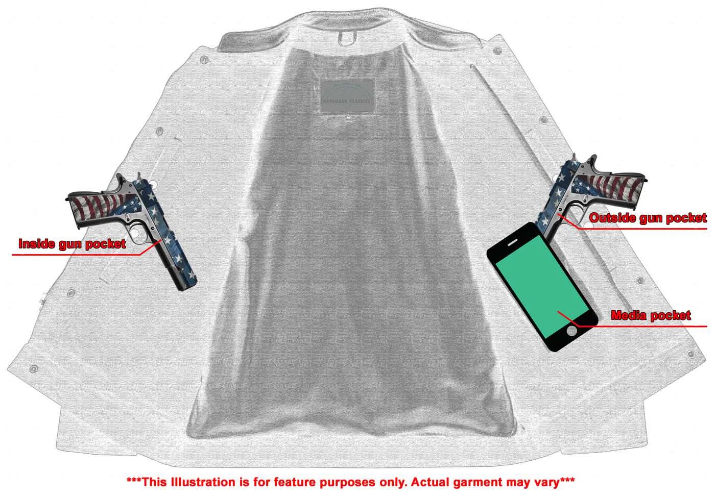 2 upgraded style concealed gun pockets. One between the snap and the zipper. Both made of special heavy-duty textile with built-in holsters and snap closure.