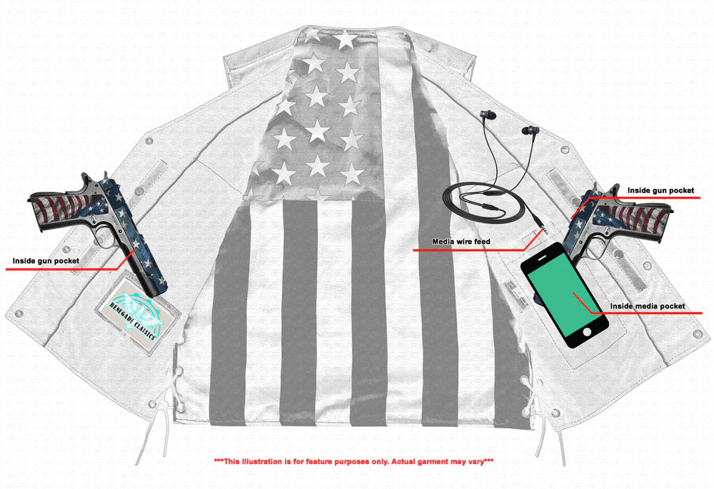 2 inside concealed gun pockets made of special heavy-duty textile with built-in holsters and snap closure.