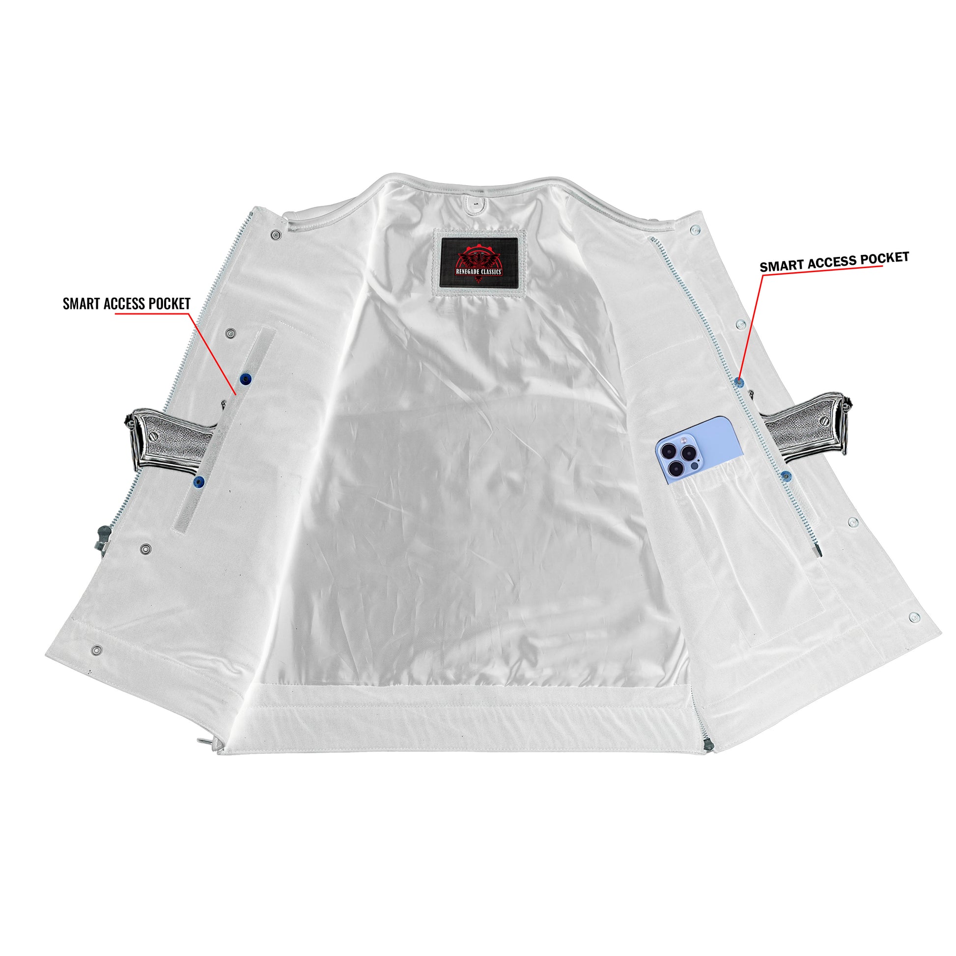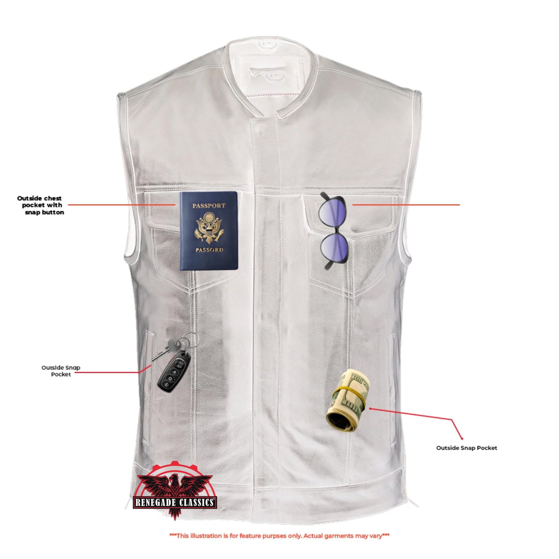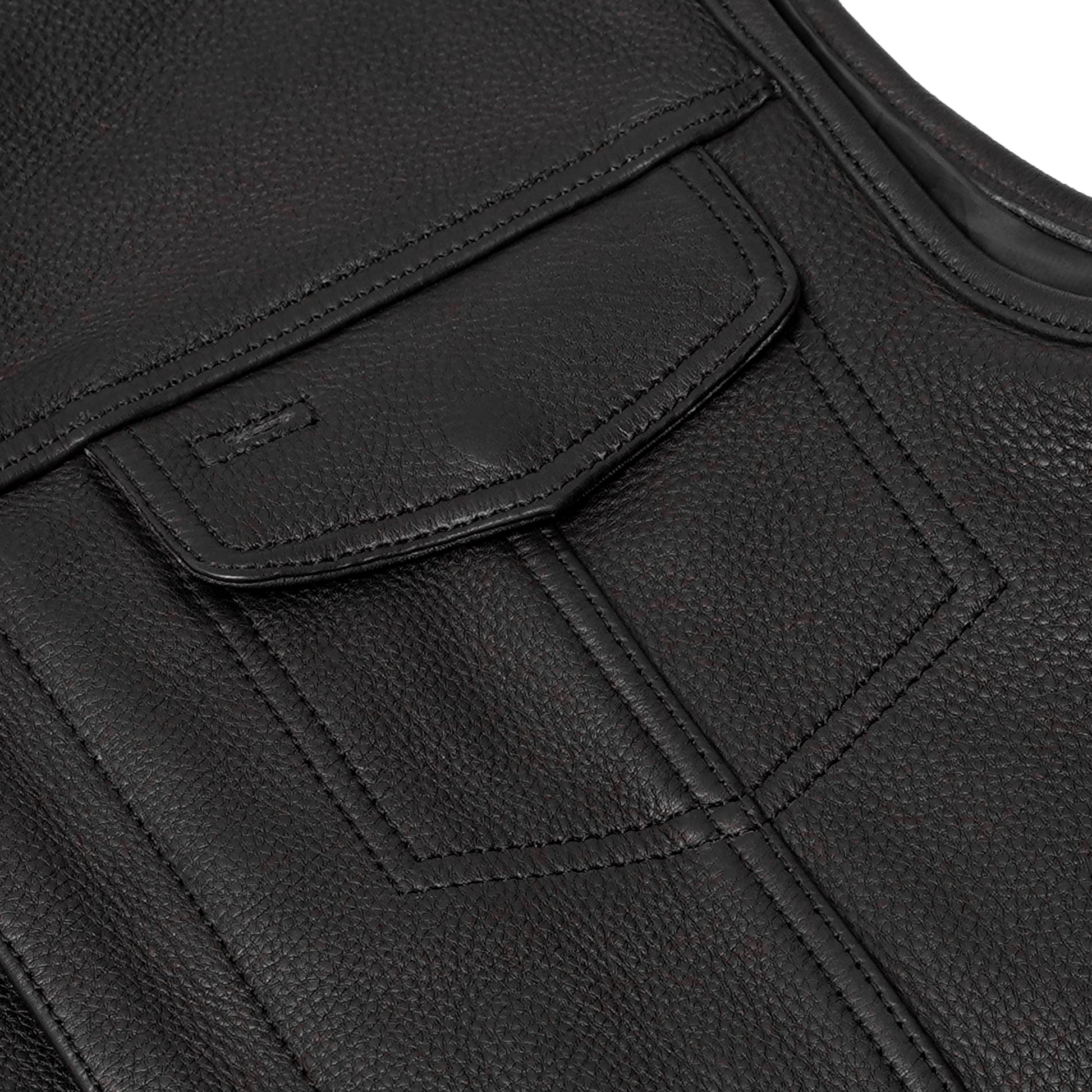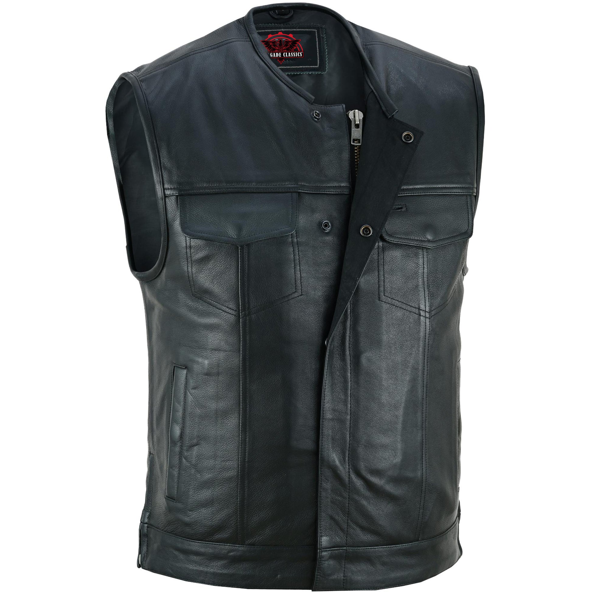 Leather vests offer mobility and security for those who carry guns on the road. Our men's gun pocket vest with bottom side zippers is perfect for bikers who want to conceal carry on or off their bike. Our vests are made of soft, premium drum-dyed milled naked cowhide 1.4-1.5mm for comfort and durability.