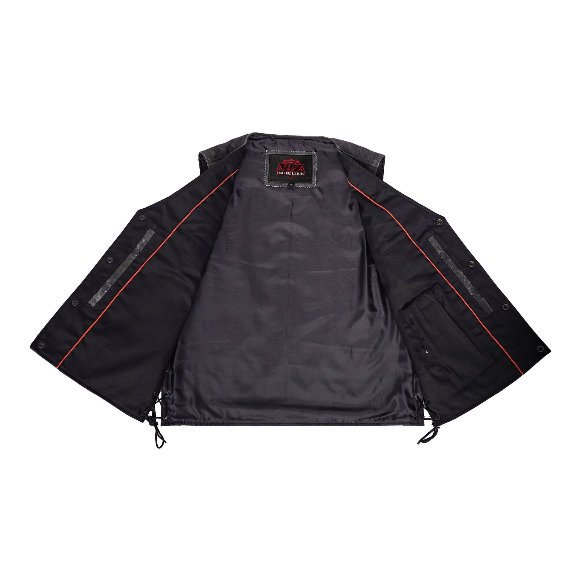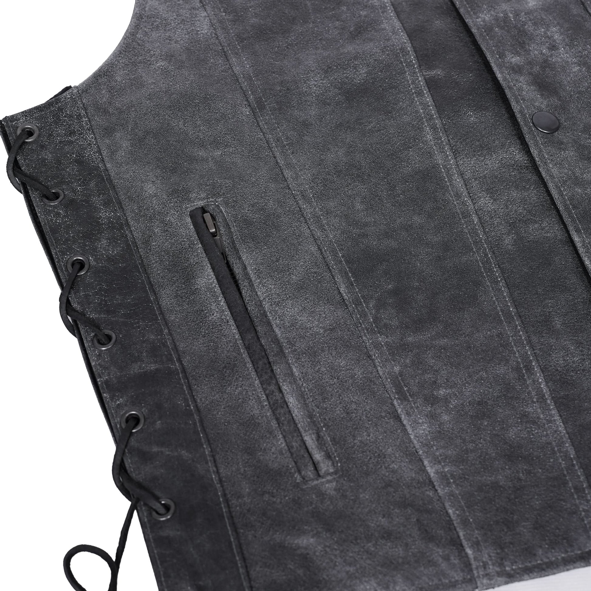 Riding with grit and style starts with the Urban Gray Biker Leather Motorcycle Vest. The soft, premium cowhide dyed gray feels broken-in from the first ride. Side lacing lets you adjust for a custom fit, and inside hidden pockets give you peace of mind. A clean single-panel back makes room for your patches or club name. This men’s leather vest or leather vest for bikers rides with you in style and grit.