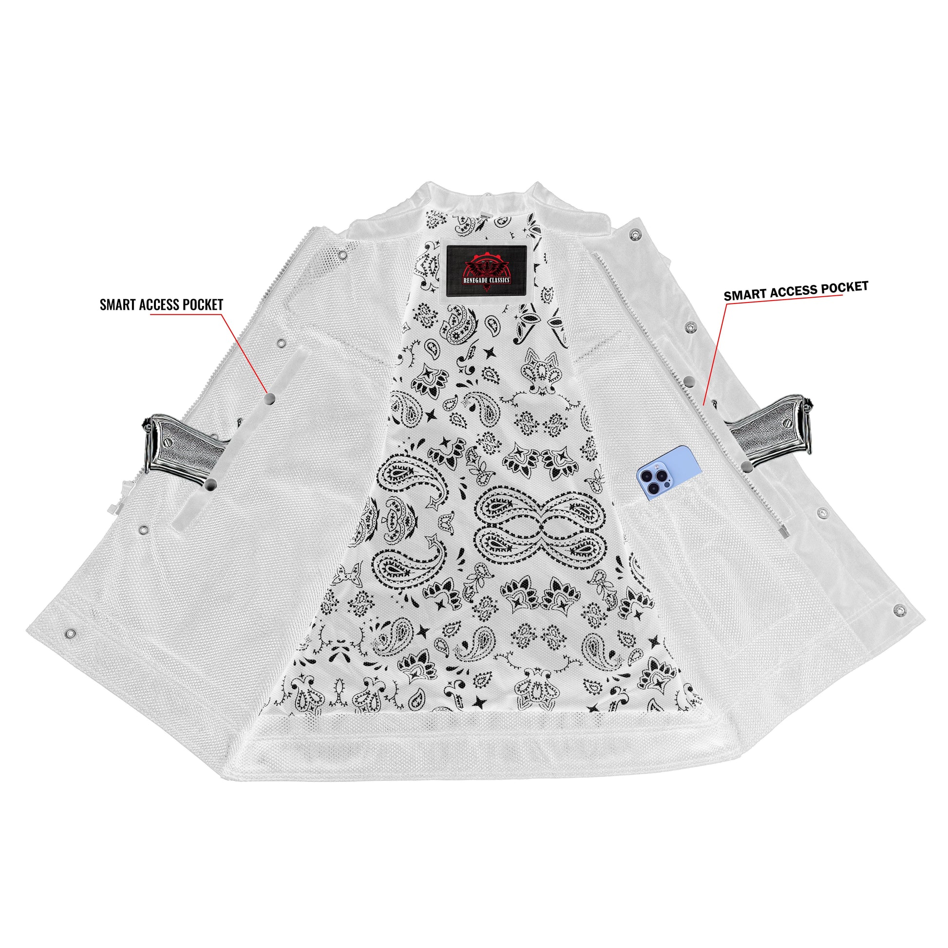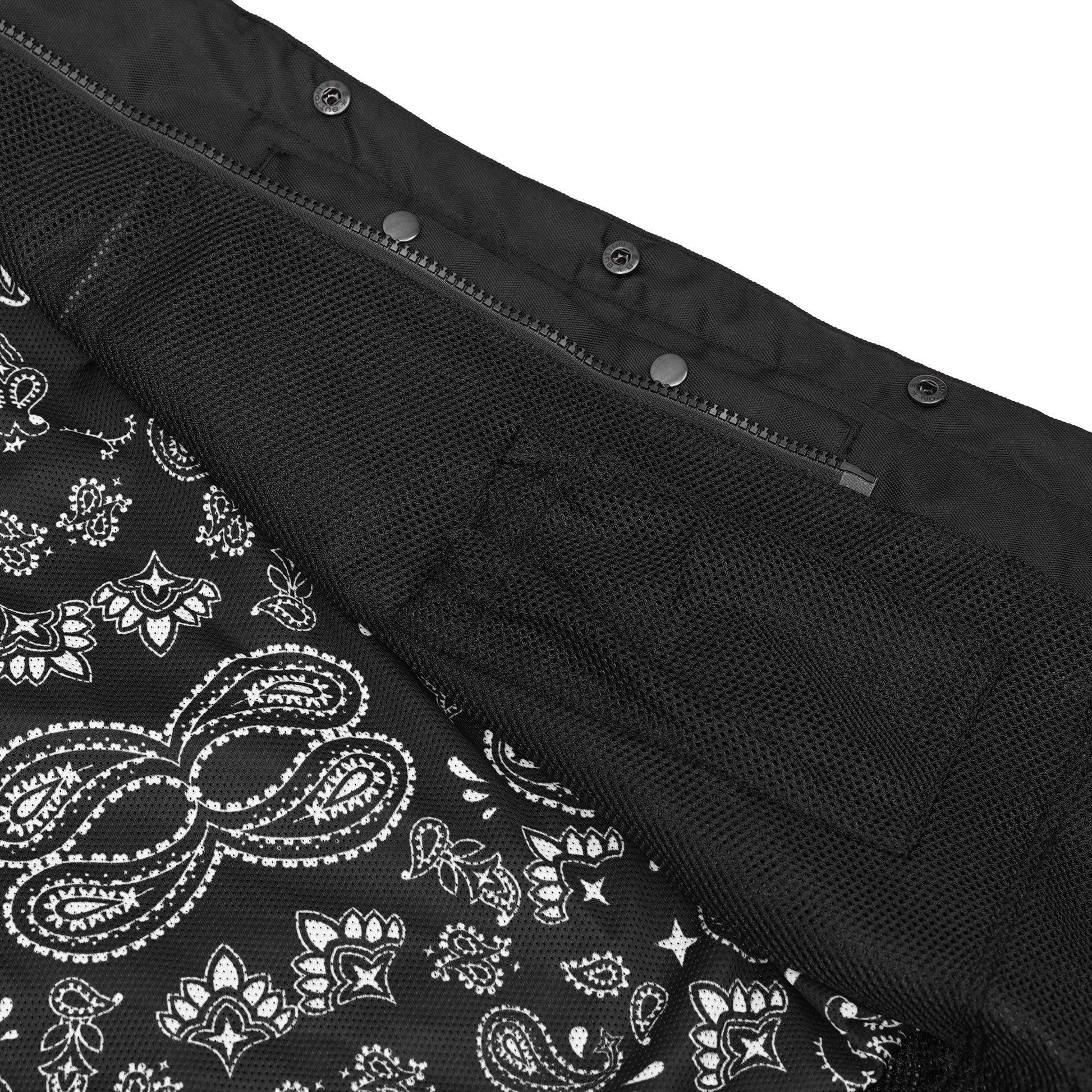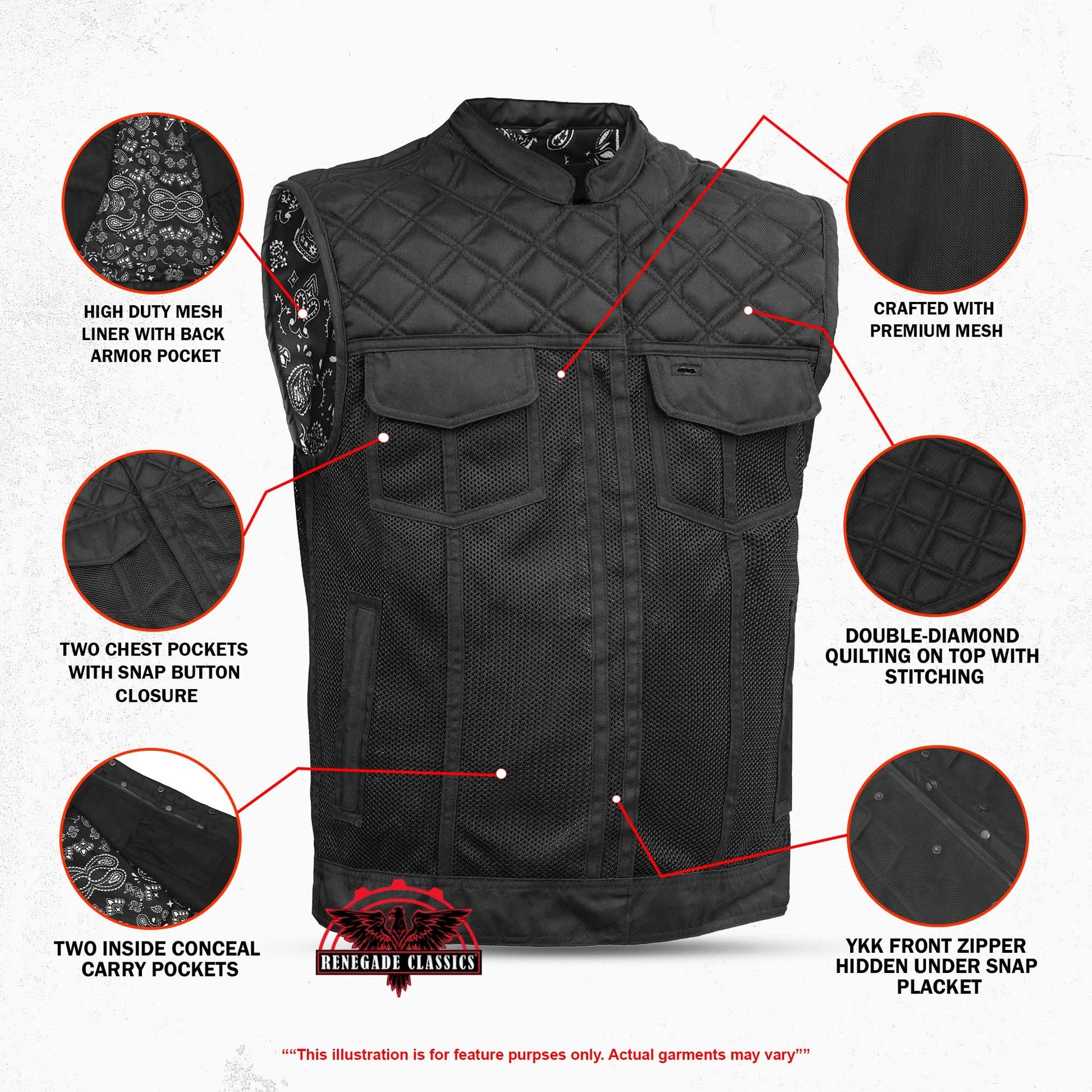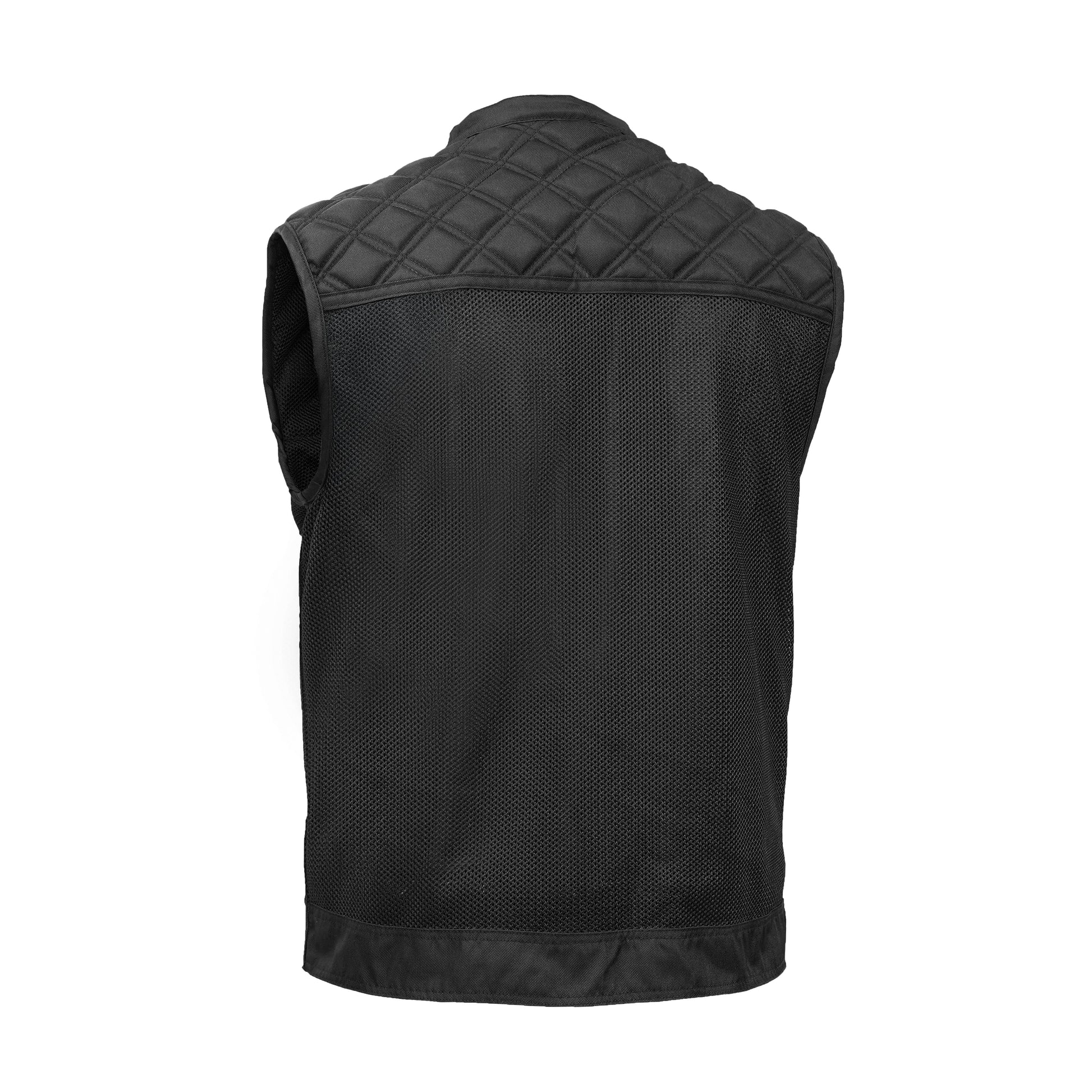 Vapor Shield men’s textile motorcycle vest is the perfect vest for hot weather riding. It uses high-duty mesh for maximum airflow, keeping you cool and comfortable all day. Built tough for safety, it features a unique double-diamond quilted top that adds classic style. The vest includes a back pocket for armor protection and two secure inside concealed carry pockets. The front closes with a strong YKK zipper and snaps — offering comfort, style, and safety in one.