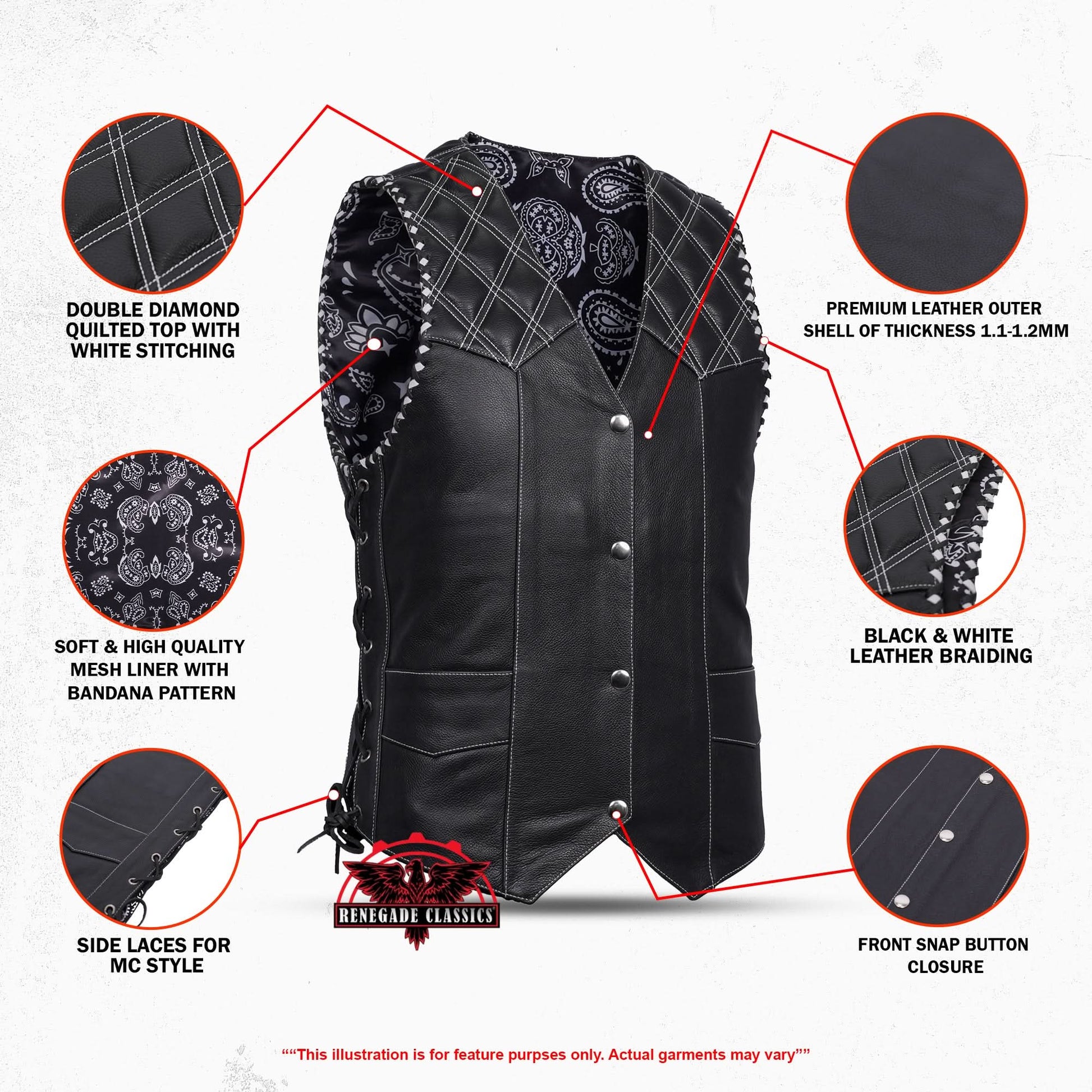 The Velrik Men’s Leather Vest is designed for riders who want both durability and style on the road. Made from premium quality leather, this vest features quilted shoulder panels with contrast stitching that give it a bold edge. The snap-button front closure ensures easy wear, while the adjustable side laces provide a custom fit for comfort during long rides. Inside, a paisley bandana-print lining adds a touch of attitude. With practical front pockets and a strong, timeless design, the Velrik vest is more than just gear, it’s a statement of biker pride.