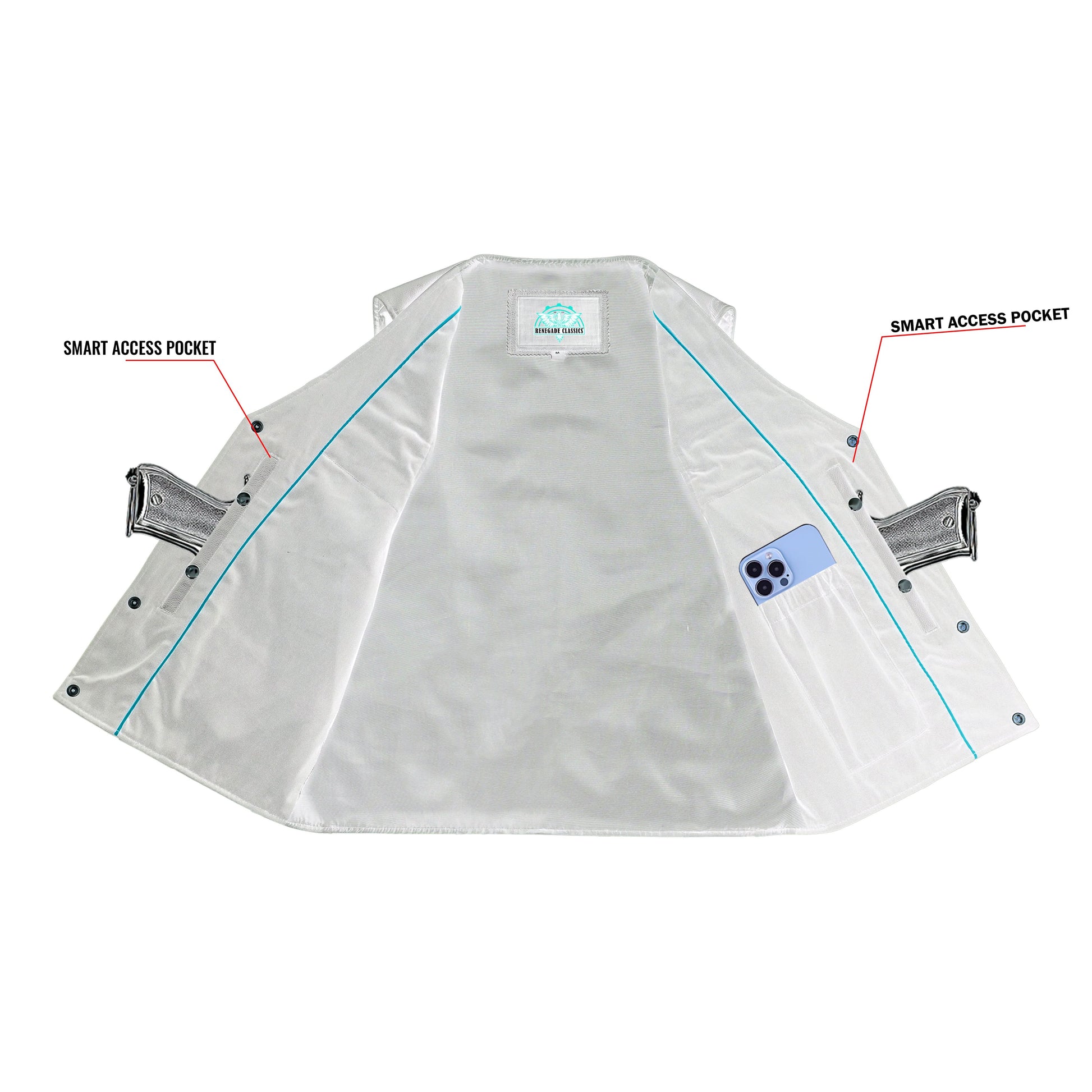 - Two hidden pockets made of heavy-duty textile, each with built-in holsters and snap closures.